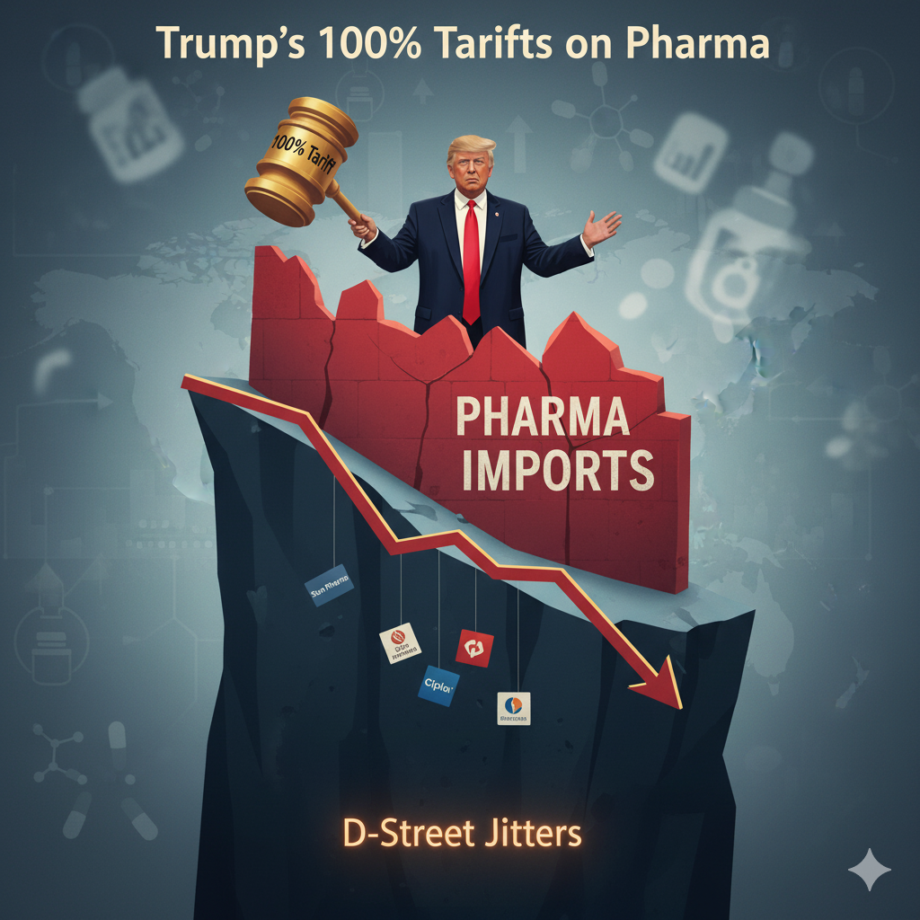 भारतीय फार्मास्युटिकल क्षेत्र, जिसे लंबे समय से एक रक्षात्मक महाशक्ति और ‘दुनिया की फार्मेसी’ के रूप में देखा जाता रहा है, अब अनिश्चितता की एक बड़ी लहर की चपेट में है। इसका कारण? डोनाल्ड ट्रंप द्वारा प्रस्तावित आयातित दवाओं पर संभावित 100% टैरिफ। जैसे ही यह प्रस्ताव चर्चा में आया, दलाल स्ट्रीट (डी-स्ट्रीट) पर इसका असर तत्काल और क्रूर रहा: सन फार्मा, बायोकॉन, और सिप्ला जैसी प्रमुख कंपनियों के शेयर मूल्यांकन में तेजी से गिरावट आई, जिसने पूरे वित्तीय तंत्र में गहरी घबराहट का संकेत दिया।